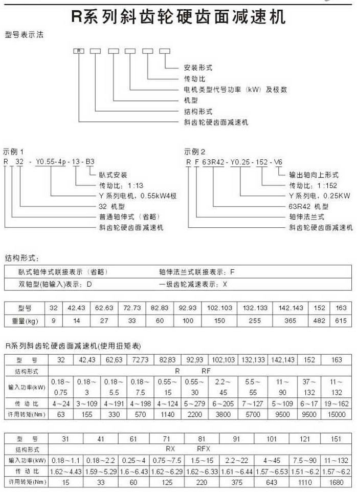 R系列斜齒輪硬齒面減速機型號表示法結構形式使用扭矩表